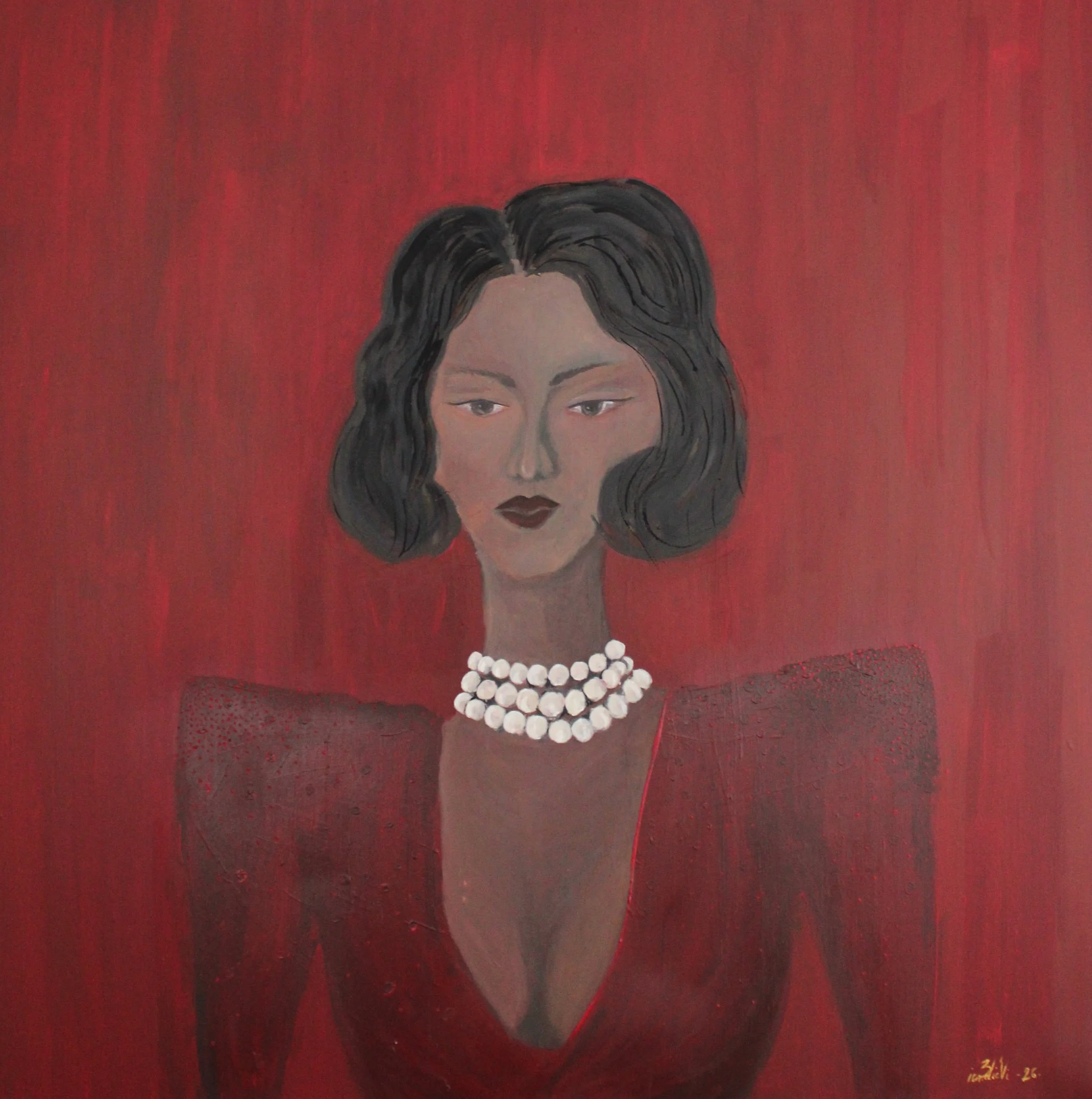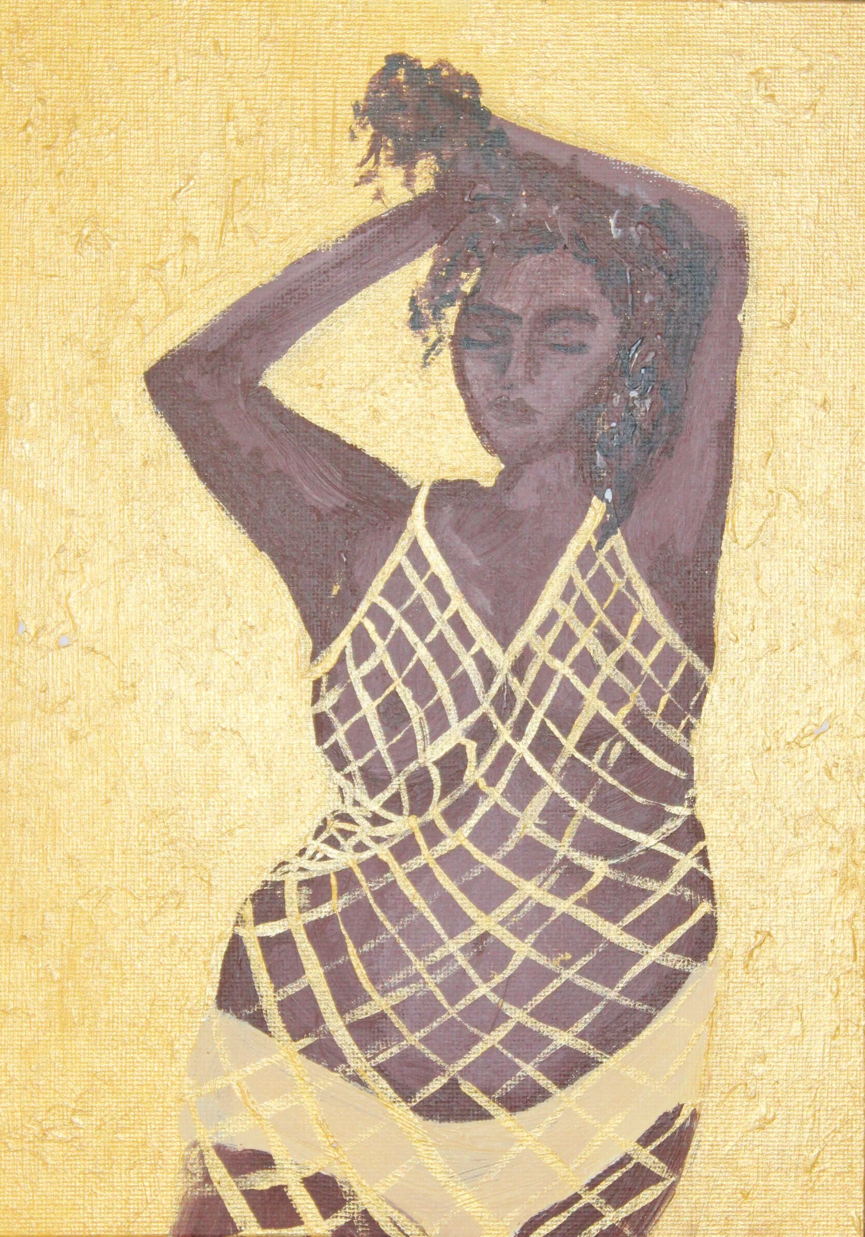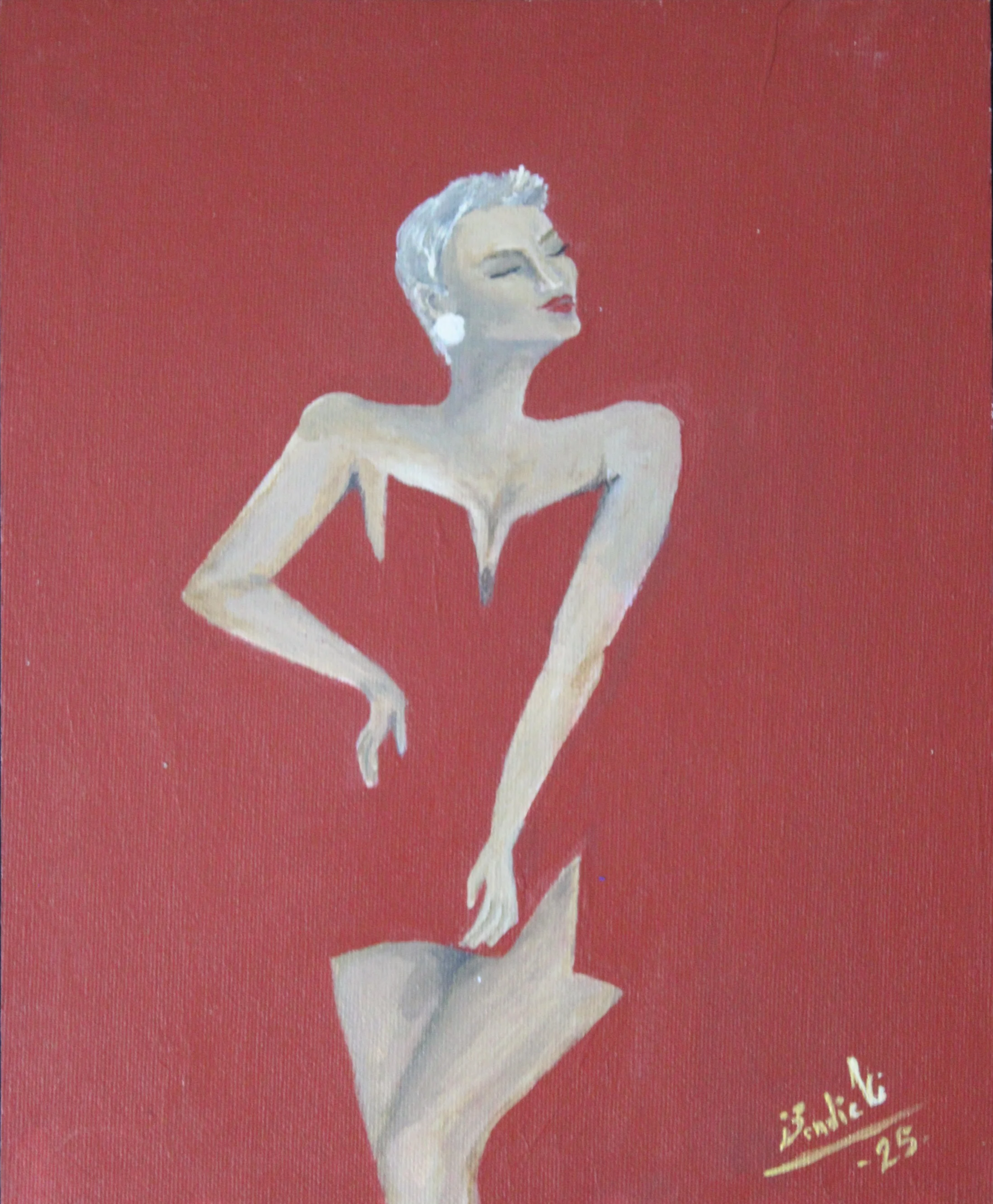 Vivekas paintings create the illusion of garments without ever painting a single dress, proving that identity and strength are the true couture. Each work becomes a portrait of defiance, elegance, and the unshakable truth that it’s the woman who makes the dress, never the other way around. In this project the artist experiments with different materials and technique from paper prints to photography and different metals.